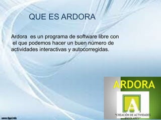 Ardora es un programa de software libre que permite crear diversas actividades educativas interactivas como crucigramas, sopas de letras, textos para completar y paneles gráficos. Se basa en la teoría cognitivista de que los estudiantes construyen activamente el conocimiento. Ofrece las ventajas de ser gratuito, fácil de usar y disponible en varios idiomas, aunque requiere instalar Java y puede contener virus.