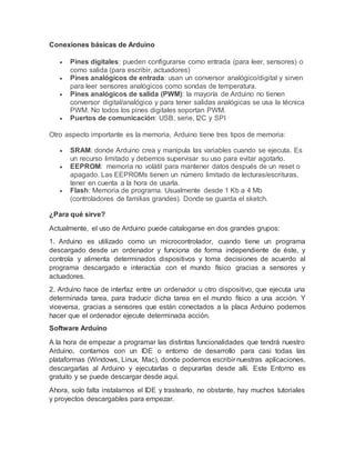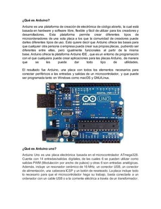 Arduino es una plataforma de hardware y software libre que permite a creadores y desarrolladores diseñar placas electrónicas de una sola placa con microcontroladores. La plataforma incluye el entorno de desarrollo Arduino IDE para programar las placas y darles diferentes usos mediante entradas, salidas y comunicaciones. Arduino Uno es una de las placas más populares, basada en el microcontrolador ATmega328 y con capacidades de entrada/salida digitales y analógicas.