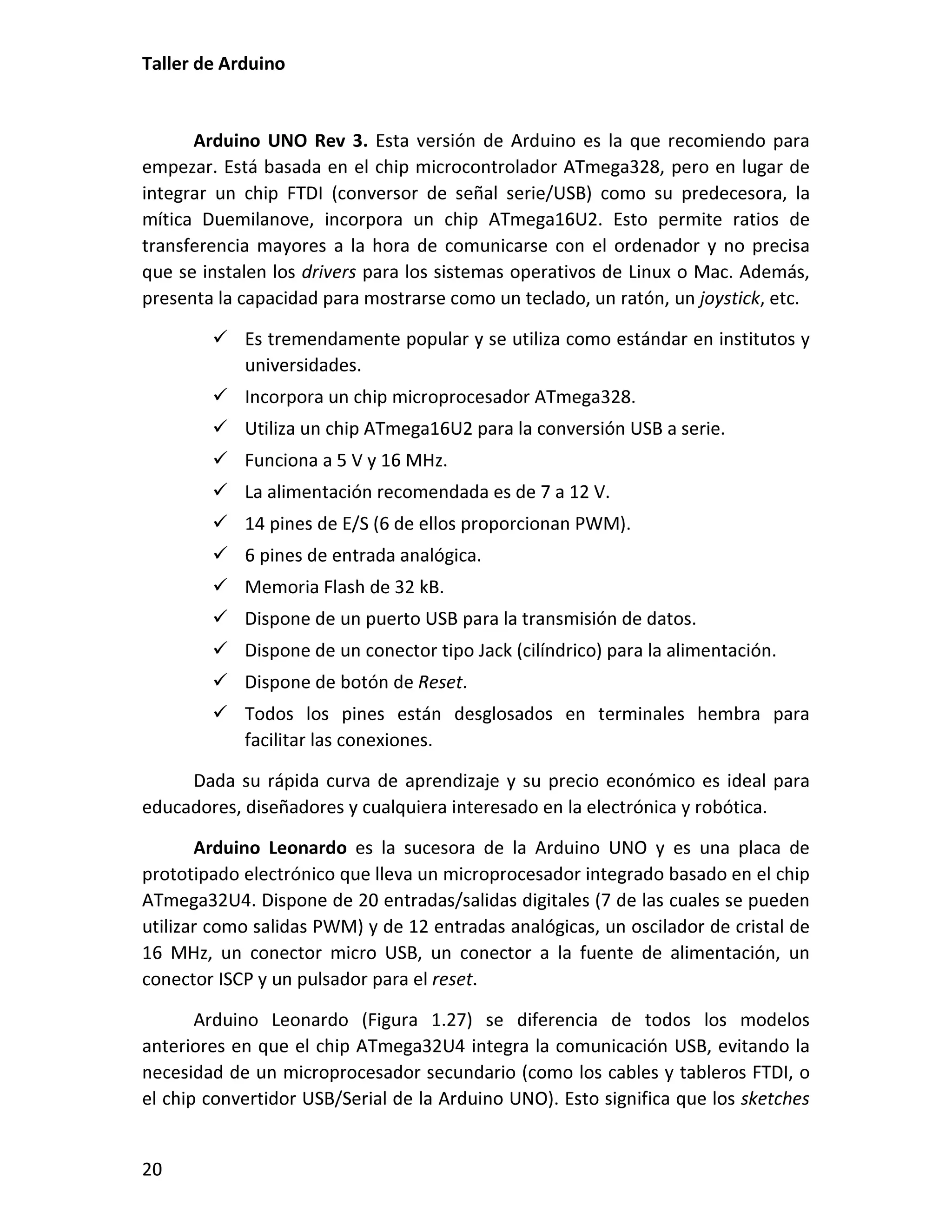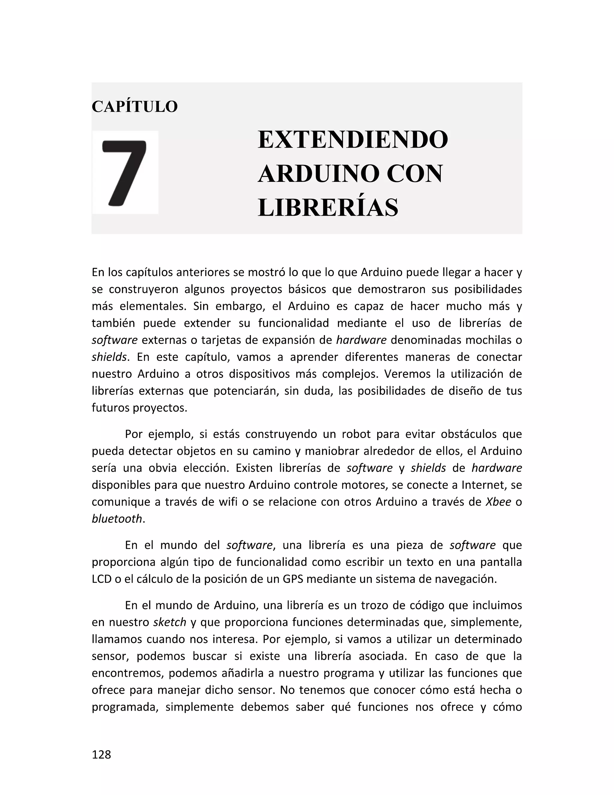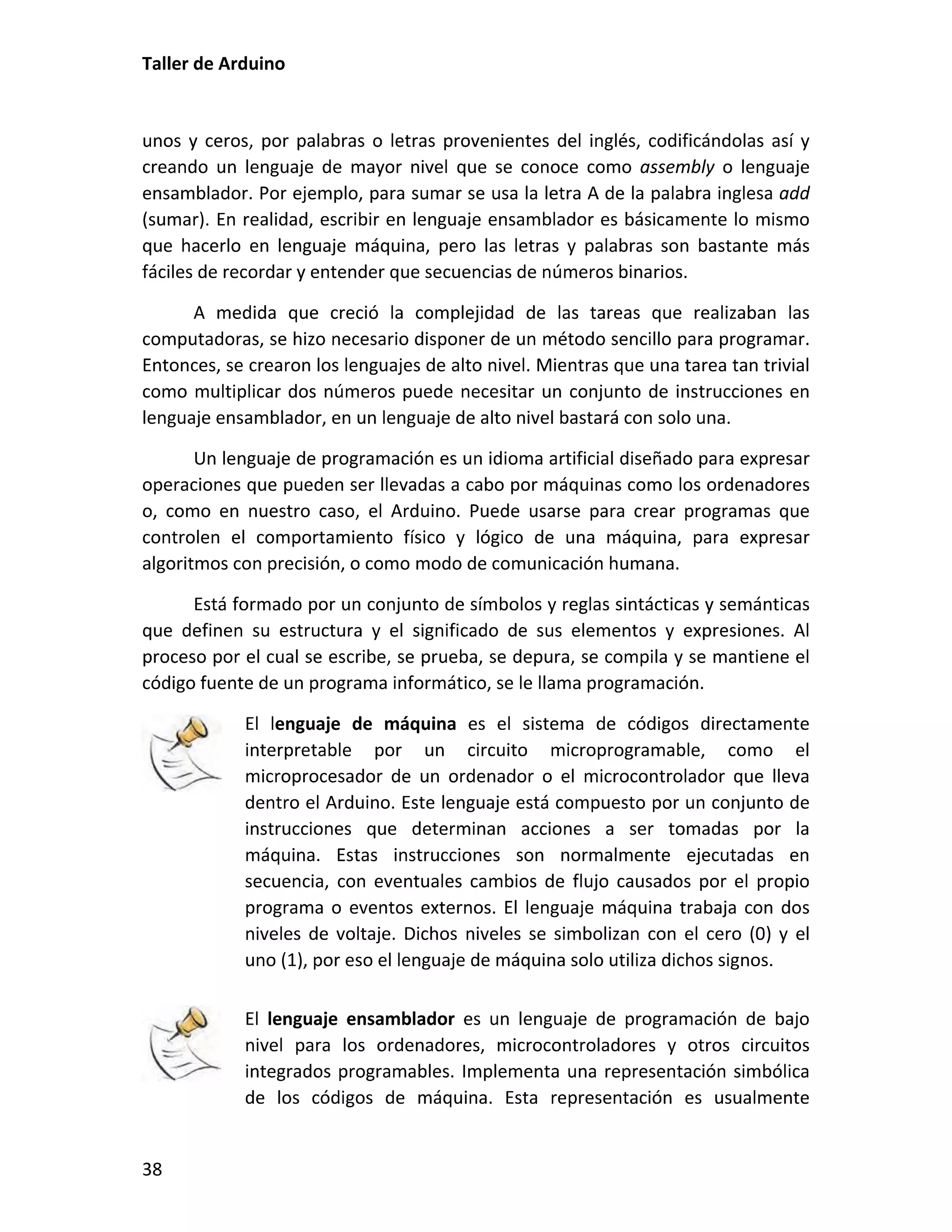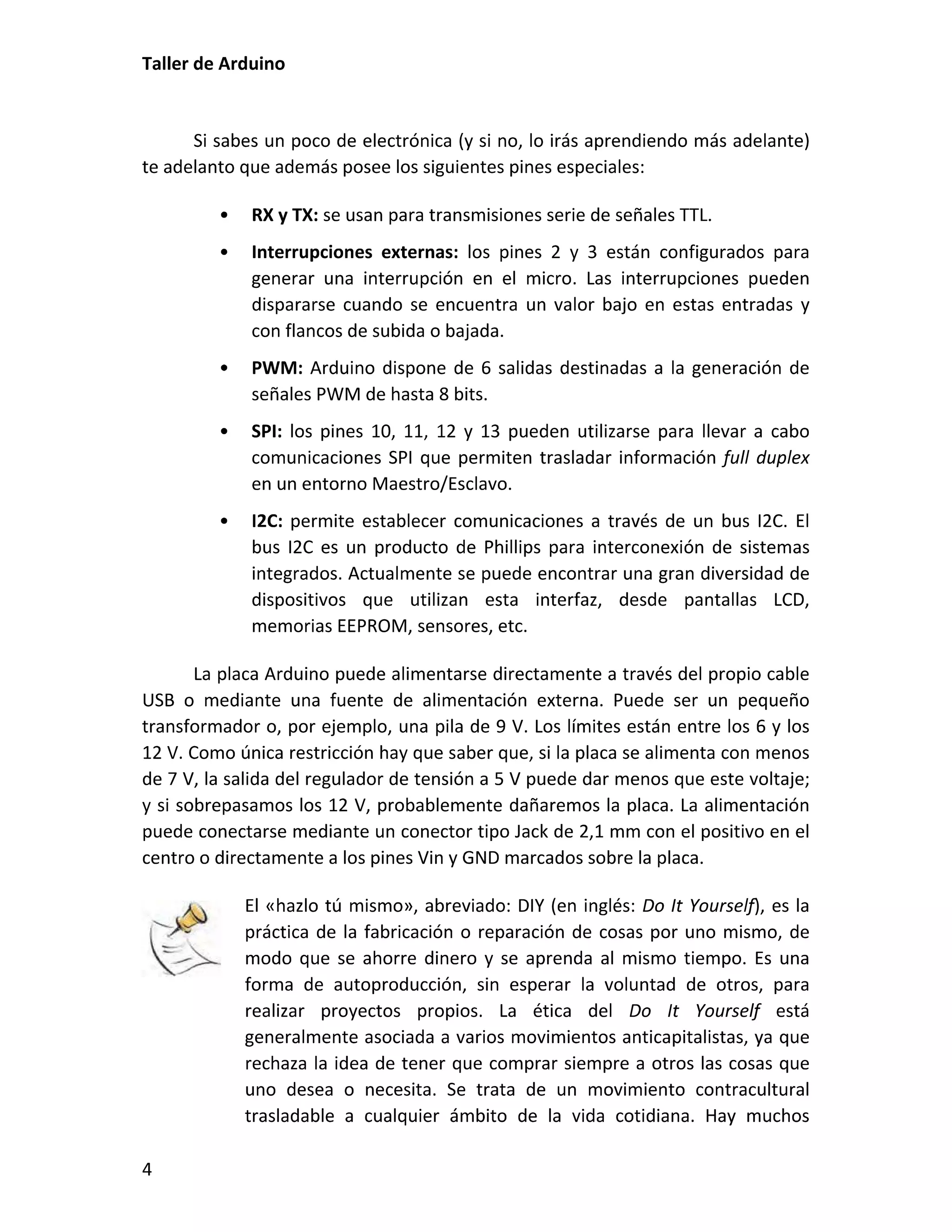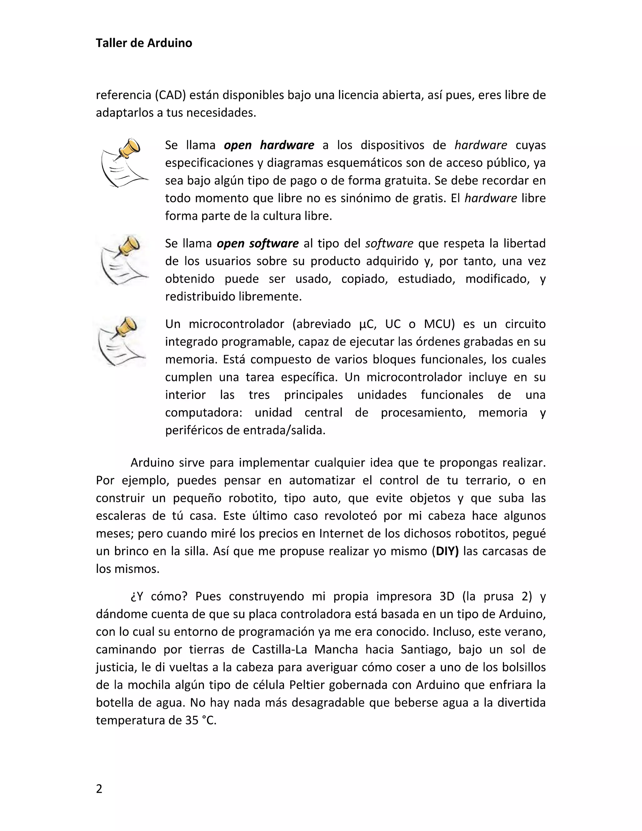 Este documento presenta un taller sobre Arduino. Explica qué es Arduino y cómo instalar el entorno de desarrollo. Luego cubre conceptos básicos de programación como variables, operadores y estructuras de control. Incluye varias prácticas utilizando LEDs, pulsadores, potenciómetros y sensores. También describe librerías y cómo utilizar pantallas LCD con Arduino.