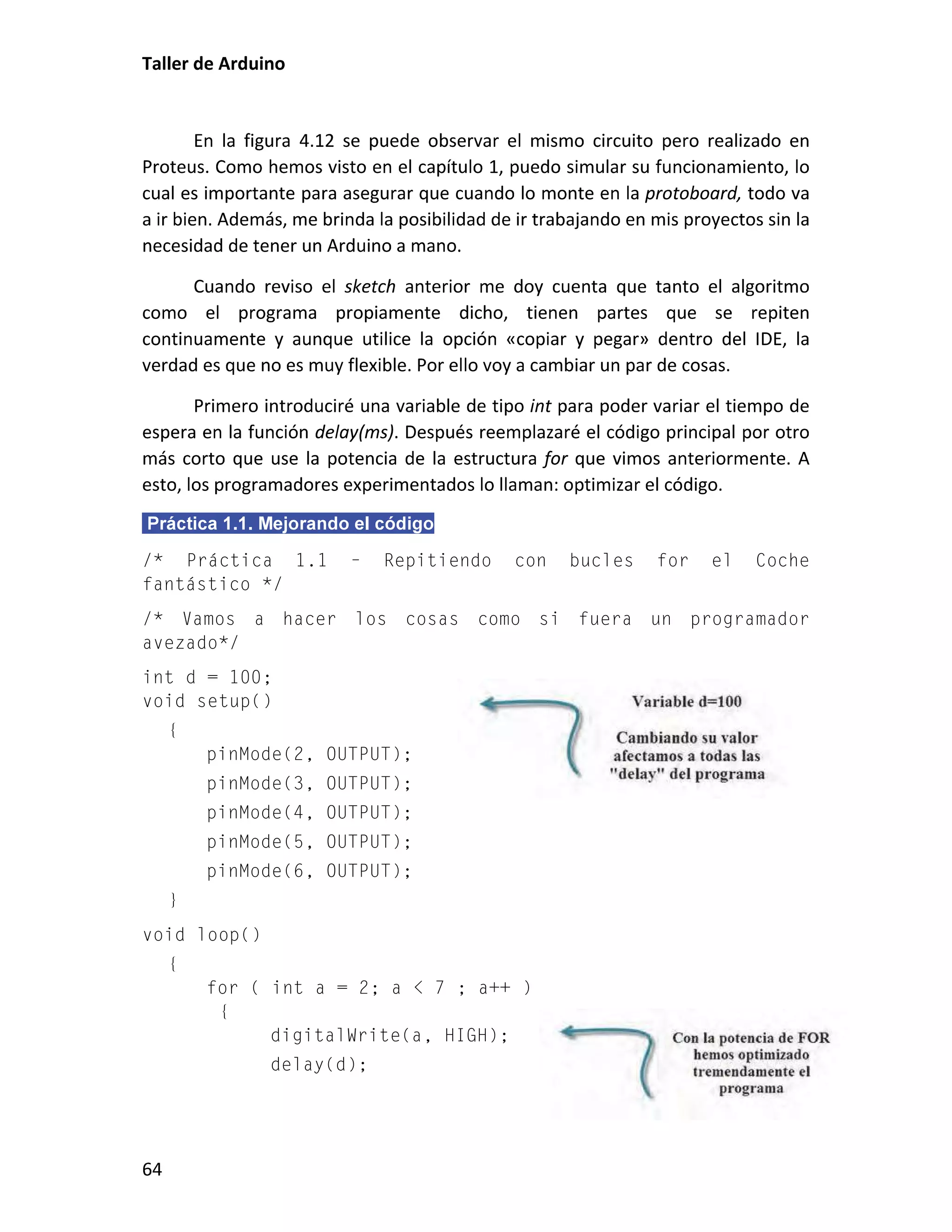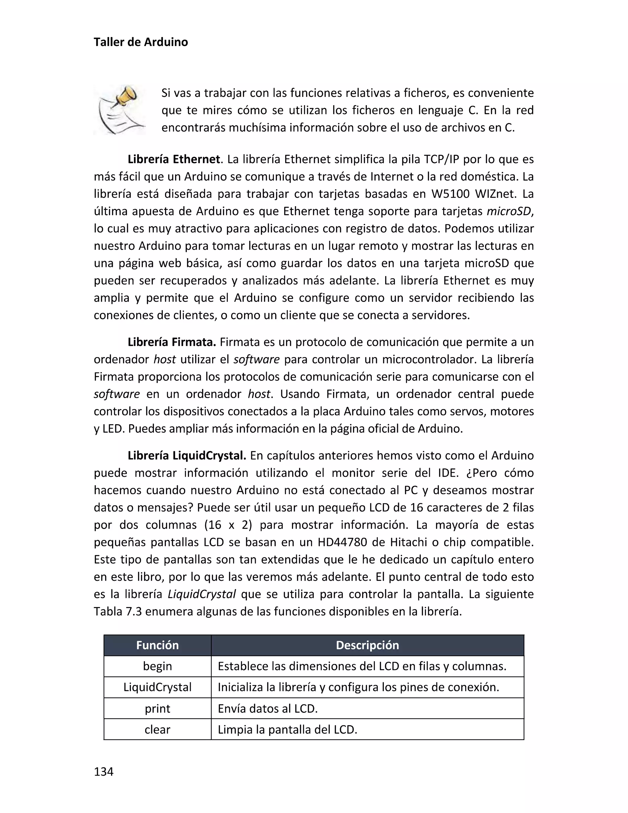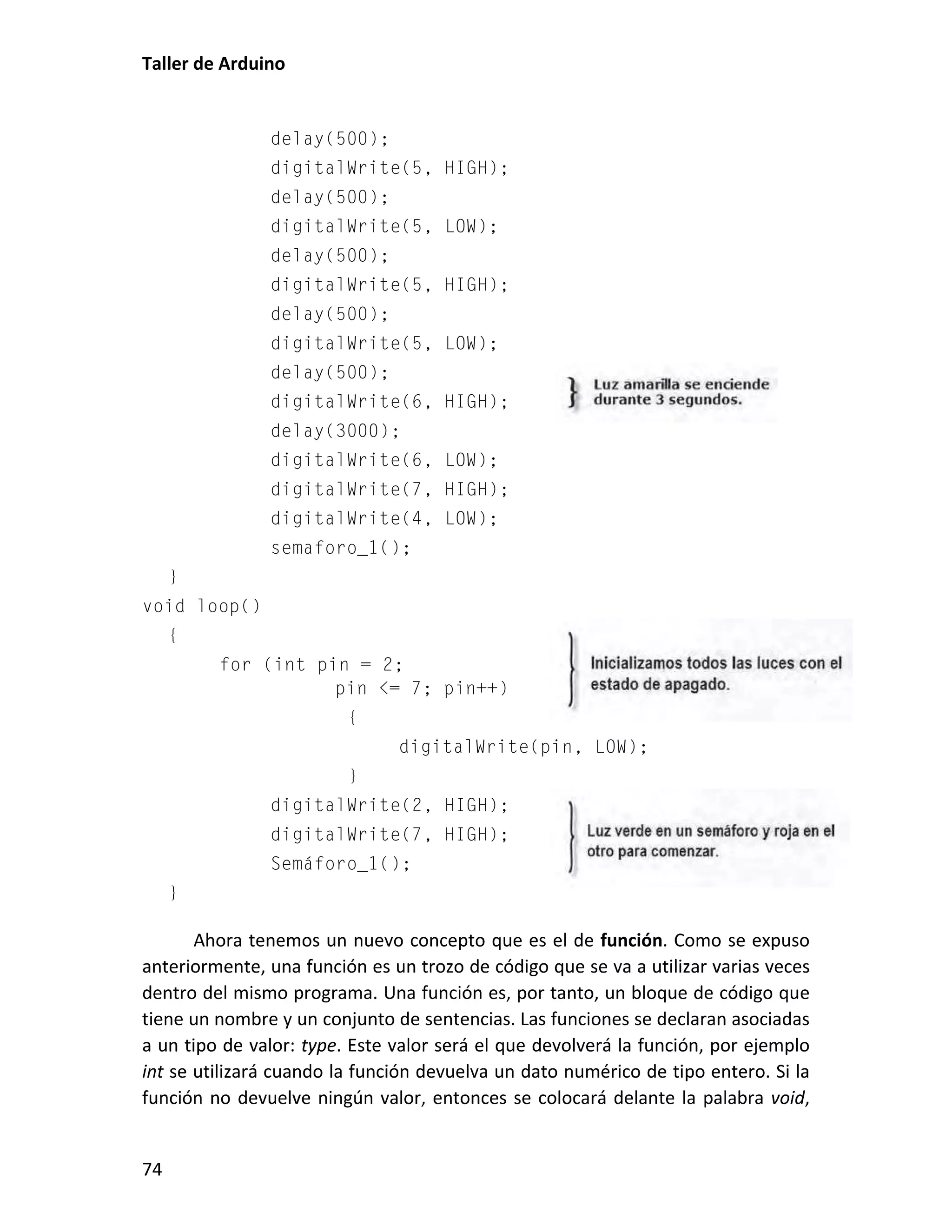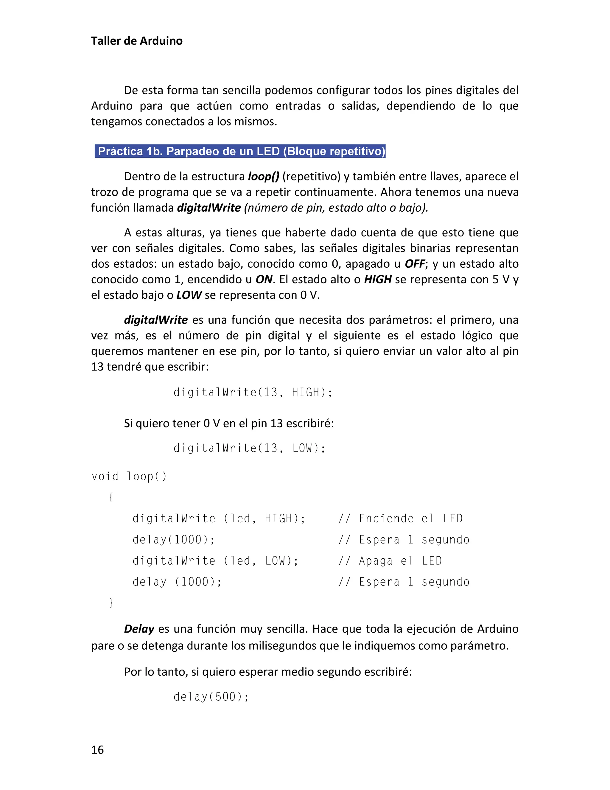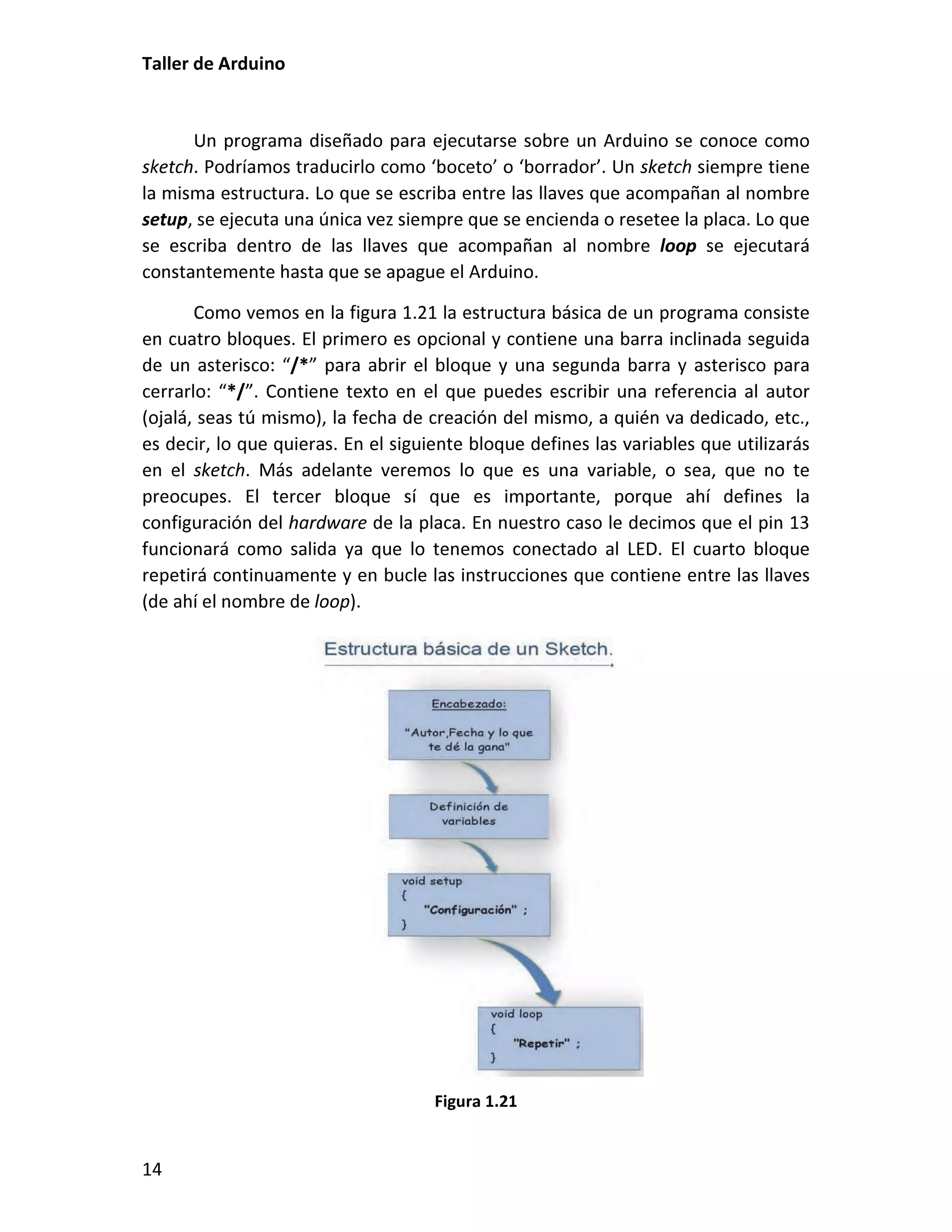 Este documento presenta un taller sobre Arduino. Explica qué es Arduino y cómo instalar el entorno de desarrollo. Luego cubre conceptos básicos de programación como variables, operadores y estructuras de control. Incluye varias prácticas utilizando LEDs, pulsadores, potenciómetros y sensores. También describe librerías y cómo utilizar pantallas LCD con Arduino.