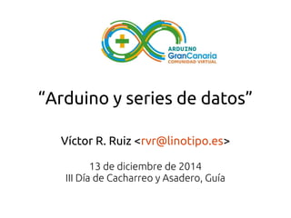 Este documento describe diferentes métodos para almacenar y acceder a series de datos generados por un Arduino. Explica cómo usar Python para comunicarse con Arduino y guardar los datos en una base de datos SQLite local, o enviarlos a ThingSpeak para almacenarlos en la nube. Además, muestra cómo acceder a los datos de SQLite desde LibreOffice y visualizar gráficos de series de tiempo almacenadas en ThingSpeak.