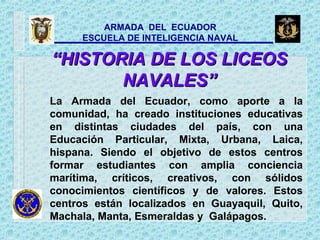 La Armada del Ecuador ha creado varios Liceos Navales en ciudades del país desde 1970 para formar estudiantes con conciencia marítima y sólidos conocimientos. Estos Liceos incluyen el Liceo Naval de Guayaquil (1973), el Liceo Naval de Quito (1986), el Liceo Naval de Jambelí en Machala (1990), el Liceo Naval de Esmeraldas (1997) y el Liceo Naval de Manta (2001). Adicionalmente, en 1991 se creó el Centro Educativo Naval en Galápagos, el cual cambió