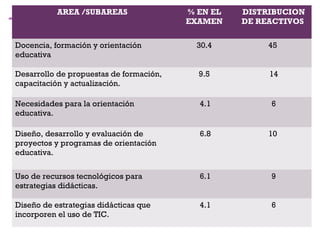Este documento presenta las áreas y subáreas de evaluación para un examen sobre docencia, formación y orientación educativa. La primera área, docencia, formación y orientación educativa, representa el 30.4% del examen con 45 reactivos. Las cinco subáreas restantes son desarrollo de propuestas de formación, necesidades para la orientación educativa, diseño de proyectos y programas de orientación, uso de recursos tecnológicos en estrategias didácticas y diseño de estrategias didácticas con TIC. Cada subá
