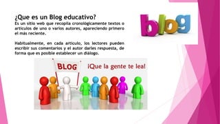 Este documento describe qué es un blog educativo, sus propósitos y tipos. Un blog educativo es un sitio web que publica cronológicamente artículos de uno o más autores sobre temas educativos. Sirve para enseñar, opinar y fomentar el diálogo. Tiene fines como apoyar una asignatura o comunicarse con otros. Sus objetivos principales son opinar, enseñar, colaborar y compartir conocimiento para transformar las actitudes de los estudiantes. Existen blogs institucionales, de profesores, de estudiantes y