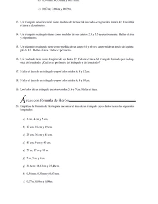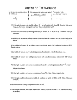 Este documento presenta diferentes fórmulas para calcular el área de triángulos, incluyendo la fórmula básica de área de un triángulo (A=1/2*b*h), la fórmula para triángulos rectángulos, y la fórmula de Herón para triángulos equiláteros. Luego proporciona varios ejemplos numéricos para calcular el área y, en algunos casos, el perímetro de triángulos usando los datos provistos y las fórmulas adecuadas.