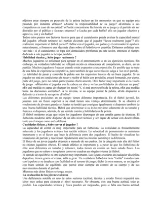 El documento describe cómo detectar talentos en el fútbol. Explica las habilidades básicas que un jugador debe tener como pasar, recibir y correr, así como una buena actitud. También destaca la importancia de observar a los jugadores en varios partidos para evaluar completamente sus habilidades técnicas, físicas y actitud. El proceso de detección de talentos es solo el primer paso, lo más importante es desarrollar esos talentos a través de entrenamiento regular bajo la dirección de entrenadores experimentados.