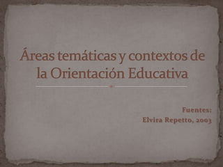 La orientación educativa incluye tres áreas temáticas principales: desarrollo académico, profesional y personal. Cada área estudia teorías y principios para diseñar intervenciones psicopedagógicas que incrementen procesos, habilidades y actitudes del estudiante, contribuyendo a su éxito y desarrollo en la escuela, trabajo y sociedad. Las intervenciones se enfocan en contextos educativos, laborales, familiares y comunitarios.