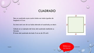 El documento presenta las fórmulas para calcular el área de cuadrados, círculos, rectángulos y triángulos. Para los cuadrados, el área es el lado elevado al cuadrado. Para los círculos, el área es pi por el radio al cuadrado. Para los rectángulos, el área es la base por la altura. Y para los triángulos, el área es la base por la altura dividida entre dos.
