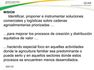 El documento resume las actividades de comercialización y mercados de UCAR. Su misión es identificar y proponer soluciones comerciales y logísticas para mejorar los procesos de creación y distribución de valor en cadenas agroalimentarias priorizadas, enfocándose en la agricultura familiar. Las cadenas priorizadas son horticultura, ganadería caprina y ovina y artesanías. UCAR tiene presencia territorial en varias provincias argentinas a través de mercados concentradores y centrales agroalimentarias. Sus