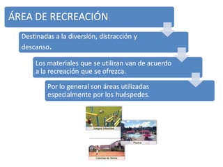 El documento describe las diferentes áreas de un establecimiento hotelero, incluyendo las habitaciones, baños, salas de estar, recepción, comedor, discoteca, spa, sala de juegos, canchas deportivas, personal, cocina, equipo y talleres de mantenimiento.