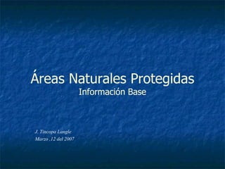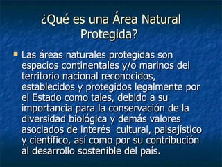 Las áreas naturales protegidas son espacios protegidos legalmente por el Estado debido a su importancia para la conservación de la diversidad biológica y los valores culturales, paisajísticos y científicos. Proveen beneficios ambientales como la regulación del clima, protección de cuencas, hábitat para la fauna y flora, y recursos genéticos y medicinales. El Sistema Nacional de Áreas Naturales Protegidas por el Estado (SINANPE) fue creado en 1990 y actualmente protege el 14.8% del