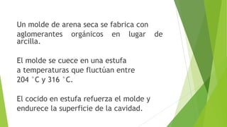 Un molde de arena seca se fabrica con aglomerantes orgánicos en lugar de arcilla y se cuece en una estufa entre 204 °C y 316 °C para reforzar el molde y endurecer su superficie. El proceso de arena seca proporciona un mejor control dimensional que los moldes de arena verde y se puede usar para metales con altas temperaturas de fusión como el acero, níquel y titanio. Los moldes más complicados son más fáciles de hacer en arena seca, que se usa principalmente para grandes piezas como bloques de motor y de