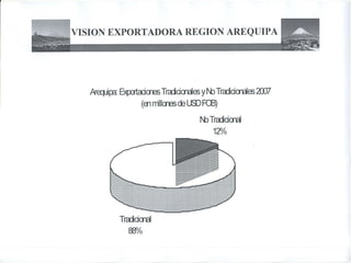 El documento proporciona información sobre el departamento de Arequipa, Perú. Ubicado en el sur del país, Arequipa limita con otros departamentos y tiene una población de aproximadamente 1.5 millones de habitantes. La capital, Arequipa, se encuentra a 2,335 metros sobre el nivel del mar y tiene una arquitectura notable de sillar. La economía de Arequipa se basa principalmente en la agricultura, que incluye cultivos como naranjas, alfalfa y cebollas.