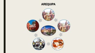 Este documento proporciona información sobre la ciudad de Arequipa, Perú. Brevemente describe la fundación de Arequipa por los españoles en 1539 y sus principales símbolos como la bandera y el himno. También resume la rica gastronomía de la ciudad, que incluye platos típicos preparados cada día de la semana, y sus danzas folclóricas. Finalmente, menciona algunos de los principales atractivos turísticos de Arequipa como el volcán Misti, el valle de Colca y su cañón