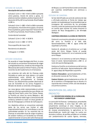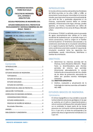Este documento presenta un estudio hidrológico del río Reque en Perú con el objetivo de determinar las máximas avenidas para diversos periodos de retorno y dimensionar adecuadamente la sección de encauzamiento del río. Incluye descripciones de la topografía, suelos, geología y canteras de la zona, así como estudios hidrológicos e hidrometeorológicos. Los resultados hidrológicos se obtuvieron usando el programa HEC-HMS, introduciendo datos pluviométricos, de la
