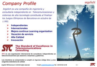 El documento presenta los servicios de gestión de gastos de telecomunicaciones de Argelich. Argelich ofrece asesoramiento independiente para ayudar a las empresas a reducir costes en telecomunicaciones a través del análisis de facturas, inventario de recursos, negociación de contratos y gestión continua. La implantación de estos servicios puede suponer un ahorro del 15-40% en costes anuales de telecomunicaciones para las empresas.