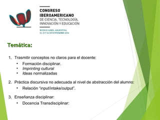 El documento aborda las deficiencias en la práctica docente de la química, destacando la transmisión de conceptos erróneos aprendidos a lo largo de generaciones, así como la falta de formación disciplinares adecuadas y un enfoque pedagógico tradicional. Se enfatiza la necesidad de una enseñanza que promueva el pensamiento crítico y la comprensión profunda de los contenidos, así como la transformación de un sistema educativo que perpetúa la alienación y el conformismo. Se propone que los docentes deberían adoptar un enfoque transdisciplinario que integre historia, filosofía y sustentabilidad en su enseñanza.