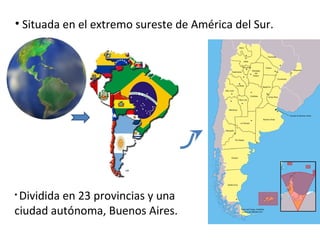 Argentina se encuentra en el extremo sur de América del Sur, dividida en 23 provincias y la ciudad autónoma de Buenos Aires. Su territorio se extiende desde los Andes en el oeste hasta el Mar Argentino en el este, y desde la selva tropical en el norte hasta la Patagonia en el sur. Algunos de sus paisajes notables incluyen el lago Nahuel Huapi compartido por las provincias de Neuquén y Río Negro, el barrio de La Boca en Buenos Aires, las cataratas del Iguazú en Misiones, y el glaciar