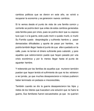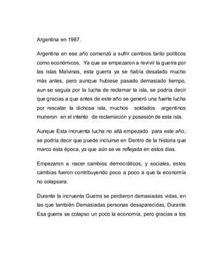 El documento describe la situación de Argentina en 1987, un año de cambios políticos y económicos luego de la guerra de las Malvinas. La economía se había derrumbado debido a la guerra y las desapariciones, pero los nuevos cambios políticos ayudaron a la recuperación económica. Además, hubo cambios democráticos y sociales que contribuyeron a evitar el colapso total.