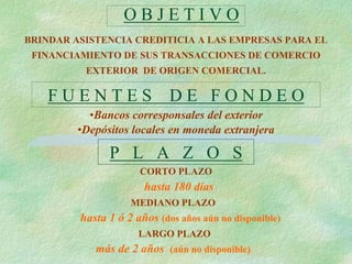 El documento resume los objetivos y modalidades de financiamiento de comercio exterior, incluyendo financiamientos de corto, mediano y largo plazo para exportaciones e importaciones. Ofrece asistencia crediticia a empresas para el financiamiento de sus transacciones de comercio exterior.