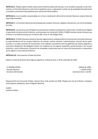 Este documento establece la creación de la Comisión Nacional de Museos y Monumentos Históricos en Argentina. La Comisión estará integrada por un presidente y diez vocales designados por seis años y dependerá del Ministerio de Justicia e Instrucción Pública. La Comisión tendrá la supervisión de los museos, monumentos y lugares históricos nacionales y trabajará con autoridades provinciales y municipales sobre sitios históricos locales. Además, la ley detalla las responsabilidades de la Comisión para catalogar,