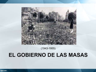 El documento analiza el período de 1943 a 1955 en Argentina, destacando la transición de un gobierno conservador a la instalación del peronismo liderado por Juan Domingo Perón. Se presentan las políticas económicas, sociales y educativas implementadas, así como la influencia de Eva Perón en el bienestar social y la organización del movimiento obrero. Finalmente, se describe la crisis política y económica que llevó al derrocamiento de Perón en 1955.