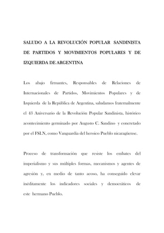 Representantes de varios partidos y movimientos políticos de izquierda en Argentina envían un saludo fraternal al pueblo de Nicaragua en el 43 aniversario de la Revolución Sandinista. Destacan que el proceso de transformación nicaragüense ha resistido los embates del imperialismo y ha elevado los indicadores sociales y democráticos a pesar de la agresión. Ratifican su solidaridad con el valiente pueblo nicaragüense, su gobierno y su revolución.