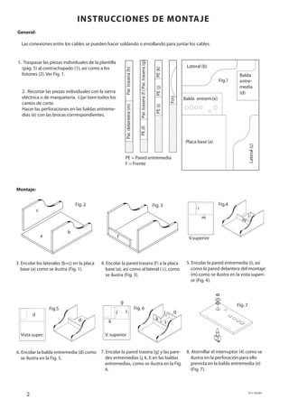 Este documento proporciona instrucciones para ensamblar una lámpara de mesa LED utilizando herramientas como sierra eléctrica, brocas, papel de lija y soldadora. Incluye una lista de materiales, plantillas para cortar las piezas de madera, y 17 pasos detallados para montar la lámpara, incluyendo cómo conectar la lámpara LED, interruptor y batería.
