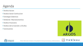 Este documento presenta un resumen de una clase sobre el énfasis del mercado de valores. La agenda incluye análisis de acciones, el sector de la construcción, estrategias de cobertura, el entorno macroeconómico y análisis financiero. Se analiza el comportamiento del sector de la construcción y la solución de Argos para mantener un equilibrio en divisas a través de coberturas naturales y financieras. Finalmente, se concluye que Argos tiene un panorama positivo debido al auge de la construcción y que cuenta con una bu