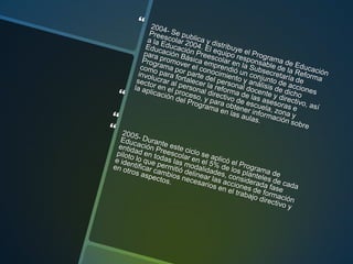 Este documento resume las reformas más importantes a la educación preescolar en México entre 1970 y 2013, incluyendo la creación de programas, licenciaturas y leyes. Algunas reformas clave fueron la creación del CONAFE en 1971 para brindar educación en zonas rurales, la licenciatura en educación preescolar en 1975, y hacer obligatoria la educación preescolar en la constitución de 2002. Los programas de educación preescolar se han actualizado varias veces para enfocarse más en un enfoque de desarrollo integral del niño