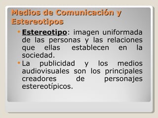 El documento presenta una introducción a los estereotipos en los medios de comunicación masiva y sus características, incluyendo que vinculan prejuicios sociales, ofrecen una visión simplista de la realidad e intolerancia a las diferencias. Luego describe diferentes tipos de estereotipos como sociales, étnicos y sexistas. Finalmente, analiza las técnicas de persuasión publicitaria a través del texto, la imagen, y la relación entre ambos, incluyendo el uso de personajes, planos y colores.
