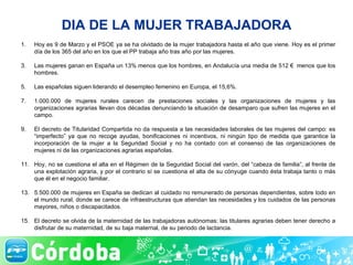 El documento habla sobre los derechos de las mujeres trabajadoras en España. Critica al PSOE por no hacer lo suficiente para apoyar a las mujeres, mientras que elogia al PP por sus esfuerzos para promover la igualdad de género en el lugar de trabajo y la vida pública, como aumentar la representación femenina en cargos políticos y facilitar la conciliación de la vida laboral y familiar. También destaca los desafíos específicos que enfrentan las mujeres rurales y propone más medidas de apoyo para promover su empoderamiento econ