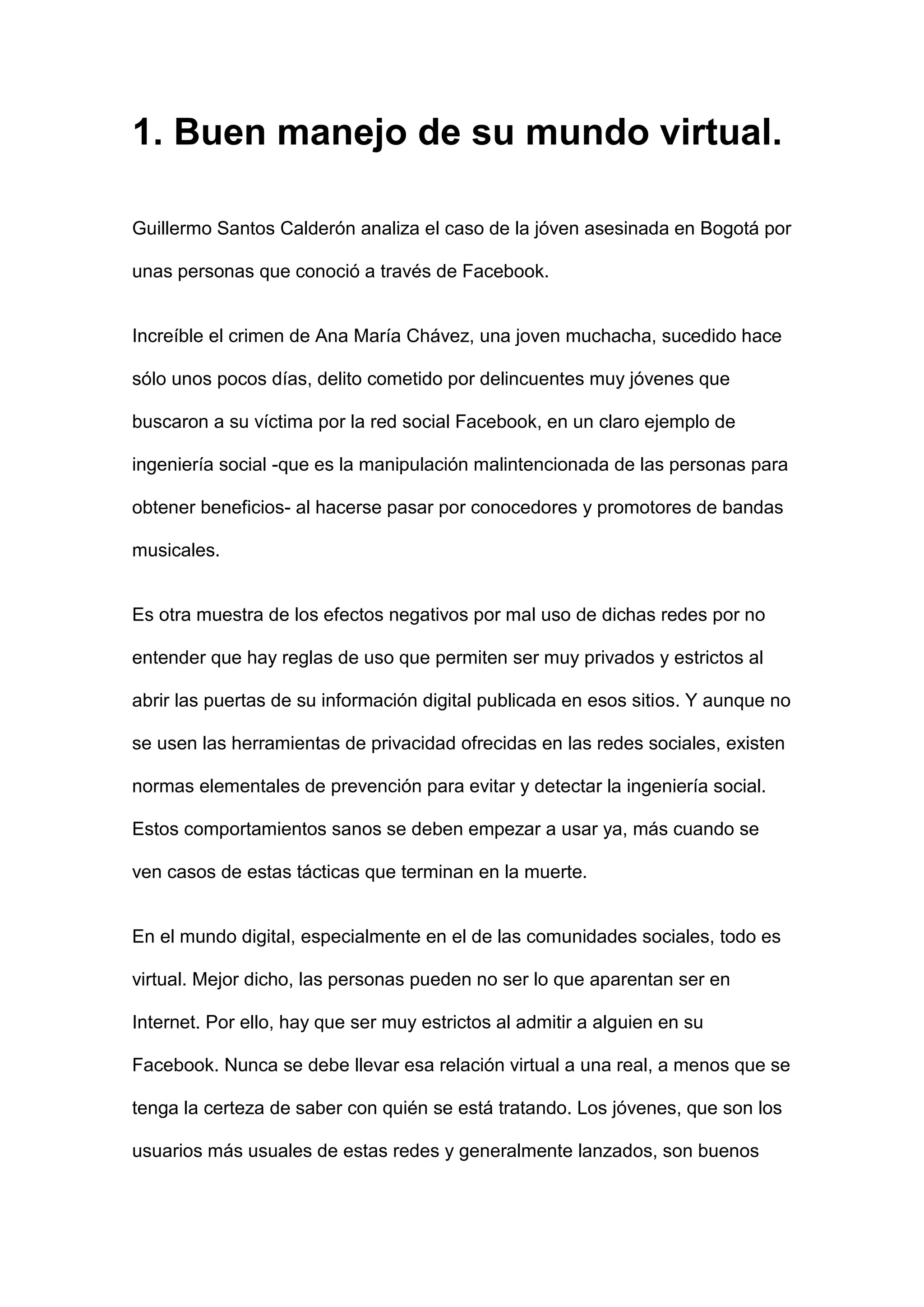 El documento habla sobre los riesgos de usar las redes sociales y compartir información personal con desconocidos. Relata el caso de una joven que fue asesinada luego de conocer a sus agresores a través de Facebook. Recomienda ser cautelosos al compartir datos personales online y no confiar completamente en la identidad o intenciones de personas desconocidas en Internet.