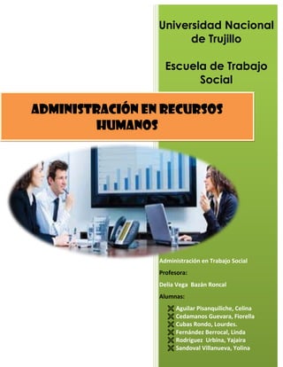 Este documento contiene información sobre un curso de administración de recursos humanos impartido a un grupo de estudiantes de la Escuela de Trabajo Social de la Universidad Nacional de Trujillo. El documento incluye la presentación del informe del curso por parte del grupo de estudiantes, así como información sobre conceptos, objetivos, actividades y funciones de la administración de recursos humanos.