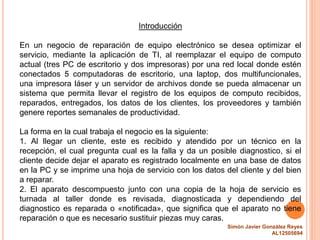 El documento describe una propuesta para implementar una red informática en un negocio de reparación de equipo electrónico con el fin de optimizar el registro y seguimiento de los equipos recibidos, reparados y entregados. La red conectará 7 computadoras de escritorio, 2 multifuncionales, una impresora láser y un servidor de archivos, además de proveer acceso inalámbrico. El propósito es mejorar la seguridad y eficiencia del proceso actual que depende de un solo equipo y documentos físicos que se mue