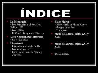 El documento resume la vida y obra de Felipe IV de España, los válidos y el Conde-Duque de Olivares durante el siglo XVII. También describe la literatura del Siglo de Oro, incluyendo a Lope de Vega y Quevedo, así como usos y costumbres como la mujer ideal y los mentideros. Incluye información sobre la Plaza Mayor de Madrid, juegos de cañas y toros. Contiene mapas de Madrid, España y Europa en los siglos XVI-XVII.