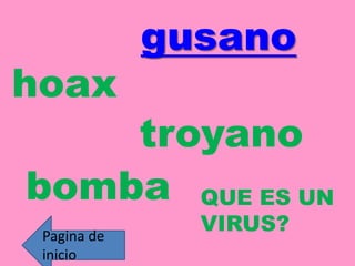 Un gusano se copia automáticamente de un equipo a otro tomando el control de las características de transferencia de archivos para viajar solo. Un hoax es un mensaje falso de correo electrónico que advierte sobre un virus inexistente. Un troyano envía información del equipo a quien lo envió a través de correo electrónico. Una bomba es código que se activa en un momento predeterminado en múltiples equipos a la vez.