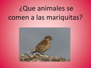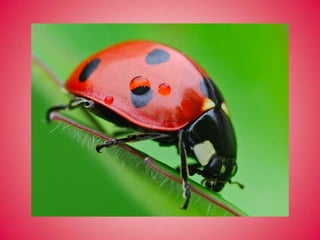 El documento habla sobre las características de las mariquitas. Explica que las mariquitas tienen forma ovalada, dos alas y viven entre 1 y 2 años. Además, se reproducen por oviposición y se alimentan de áfidos, sus principales depredadores. Por último, indica que viven en jardines y campos.