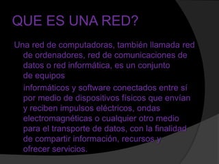 Este documento describe los diferentes tipos de redes de computadoras, incluyendo redes PAN, CAN, WAN, MAN y LAN. Explica qué es una red LAN y los tipos de topologías LAN como bus, estrella, anillo y árbol. También describe las topologías lógicas como Ethernet, Token Ring, FDDI y ATM. Finalmente, cubre los diferentes tipos de cableado de red como coaxial, par trenzado y fibra óptica.