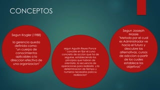 Este documento define la gerencia de mercados y sus funciones principales según varios autores. Explica que la gerencia implica planeamiento, organización, dirección y control para lograr los objetivos de una organización de manera efectiva. Además, identifica factores clave como la posición en el mercado, los recursos, los objetivos, la actitud de los trabajadores y el desarrollo gerencial para tener éxito en la gerencia de mercados.