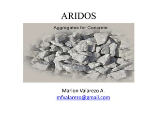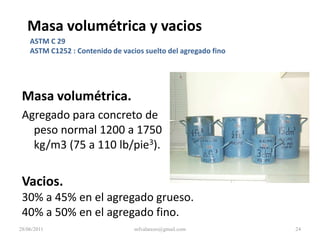 Este documento describe los diferentes tipos de agregados utilizados en la construcción, incluyendo agregados finos, gruesos, ligeros, pesados y sus características. Explica las pruebas realizadas para evaluar las propiedades de los agregados como la granulometría, densidad, absorción de agua, resistencia a la abrasión y la corrosión. También cubre los métodos de muestreo y ensayo de agregados de acuerdo con las normas ASTM.