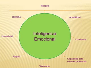 La inteligencia emocional se representa como un círculo con varios conceptos clave como el respeto, la honestidad, la amabilidad, la capacidad para resolver problemas, la alegría, la tolerancia y la conciencia, que son importantes para expresarse a uno mismo y relacionarse con los demás.