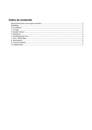 Este documento lista y describe 10 herramientas para crear mapas mentales. Algunas de las herramientas mencionadas incluyen MindMup, LucidChart, Coogle, Simple Surface y Realtimeboard. Cada herramienta se describe brevemente con sus características principales y enlaces a tutoriales de YouTube. El documento proporciona información sobre diferentes opciones gratuitas y de pago para crear y compartir mapas mentales en línea.