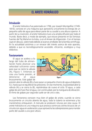 Este documento describe el funcionamiento y componentes de un ariete hidráulico. Un ariete hidráulico aprovecha la energía cinética del agua al acelerar en un tubo inclinado para bombear parte del agua a una altura mayor. Consta de un tubo de alimentación, válvulas, y un mecanismo que genera golpes de presión repetidos que envían pequeñas cantidades de agua a la vez. Es una forma eficiente y ecológica de elevar agua sin necesidad de combustible.