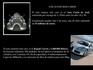 El documento describe los objetos más caros del mundo en diferentes categorías como autos, joyas, propiedades inmobiliarias, alimentos, bebidas, obras de arte y más. Algunos de los artículos más caros mencionados incluyen un auto Bugatti Veyron de $1.4 millones, una bikini de diamantes de $30 millones, una casa en Inglaterra vendida por $105 millones y una fotografía subastada por $2.3 millones.
