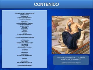 Este documento resume la vida y obra del filósofo griego Aristóteles. Aborda sus principales aportes a diversas áreas del conocimiento como la lógica, metafísica, ética, política y ciencias naturales. Asimismo, destaca su influencia en el desarrollo posterior de estas disciplinas y su legado como uno de los pensadores más importantes de la antigüedad.