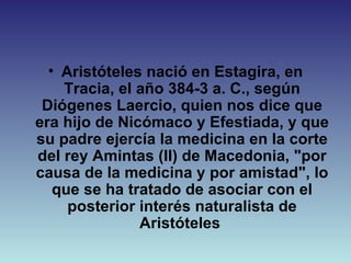 Este documento resume la vida y obras de Aristóteles. Nació en el 384 a.C. en Grecia y fue discípulo de Platón. Escribió numerosos diálogos y tratados filosóficos y científicos que abarcan temas como la lógica, la física, la biología y la metafísica. Propuso una cosmología donde el universo está compuesto por cinco elementos y la Tierra está estática en el centro, en contraste con las teorías atomistas. Su pensamiento gira en torno a