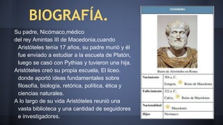 Aristóteles nació en Macedonia y estudió en la escuela de Platón. Fundó su propia escuela llamada El Liceo, donde desarrolló ideas fundamentales sobre diversas áreas del conocimiento como filosofía, ciencia y política. Escribió obras sobre una amplia gama de temas que incluyen lógica, ética, política, física y biología. Sus escritos tuvieron una gran influencia en el pensamiento occidental.