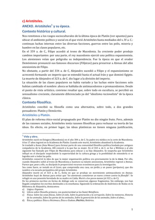 Aristóteles vivió en Grecia entre los siglos IV y V a.C., en un período de cambios políticos y expansionismo macedonio. Desarrolló su filosofía como alternativa a Platón y Demócrito. Rechazó la teoría platónica de las ideas por carecer de justificación y propuso en su lugar una filosofía basada en la observación empírica.