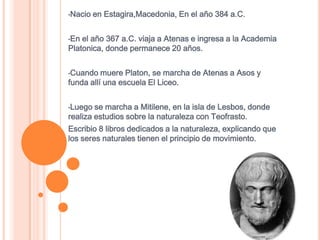 Aristóteles nació en Estagira, Macedonia en el 384 a.C. Fue un filósofo, lógico y científico de la antigua Grecia que estudió en la Academia Platonica durante 20 años y luego fundó su propia escuela llamada El Liceo. Aristóteles escribió varios libros sobre temas como la naturaleza, la lógica y la biología.